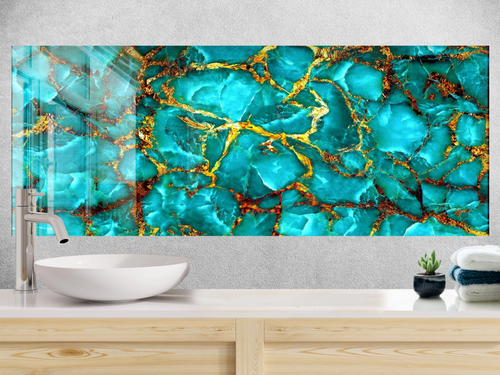 A teal marble backsplash behind the sink adds that fresh pop while protecting the wall in a stylish way. The mix of teal tones and subtle veining brings in an aquatic feel that’s lively but not too loud.