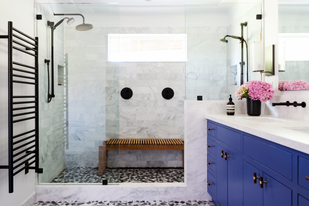 Light azure blue marble floors give the whole bathroom this airy serene quality like you’re floating on a clear sky. It’s subtle so it works with almost any style and makes the space feel bigger and brighter.