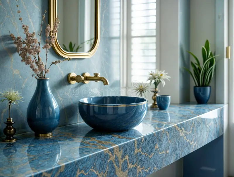 Deep sapphire blue marble on the counters brings in that jewel-like drama everyone loves. It looks incredible against lighter cabinets or white sinks and the veining adds so much natural beauty.