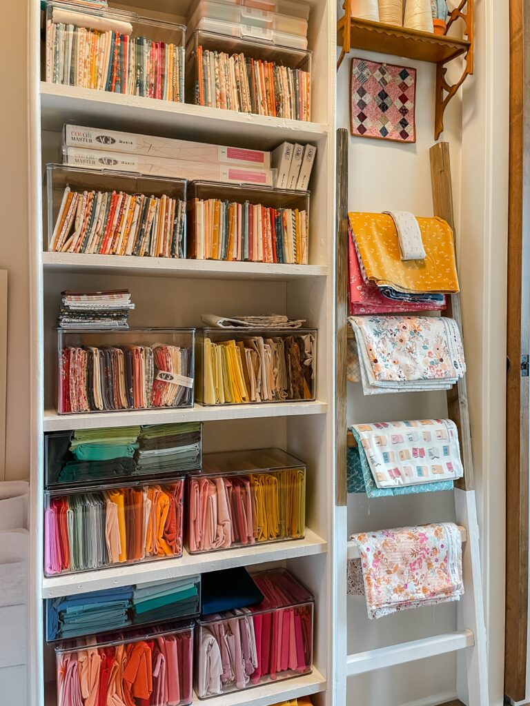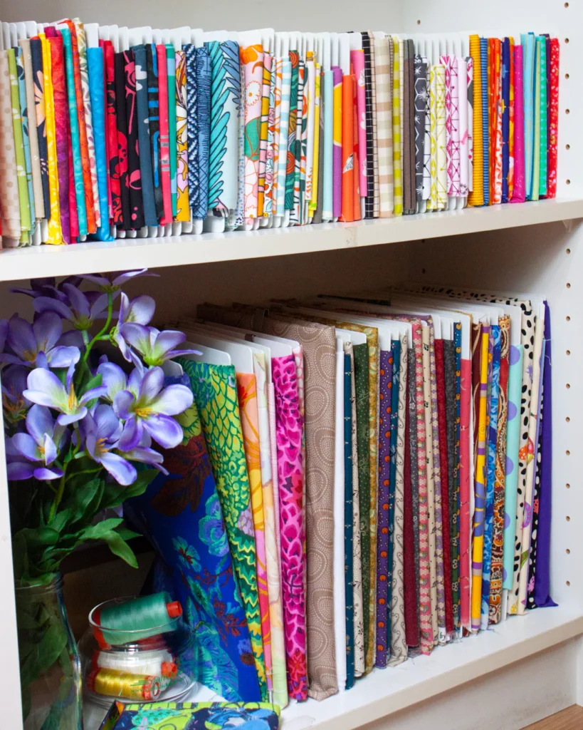 Wind fabric onto mini bolt boards—acid-free cardboard or plastic sheets designed specifically for fabric storage. These boards keep fabrics neatly wrapped and labeled, preventing the creases and wrinkles that come from folding. Stored upright in bins or on shelves, mini bolts create uniform, library-like organization that’s both practical and visually satisfying.