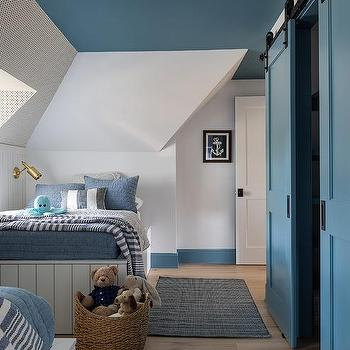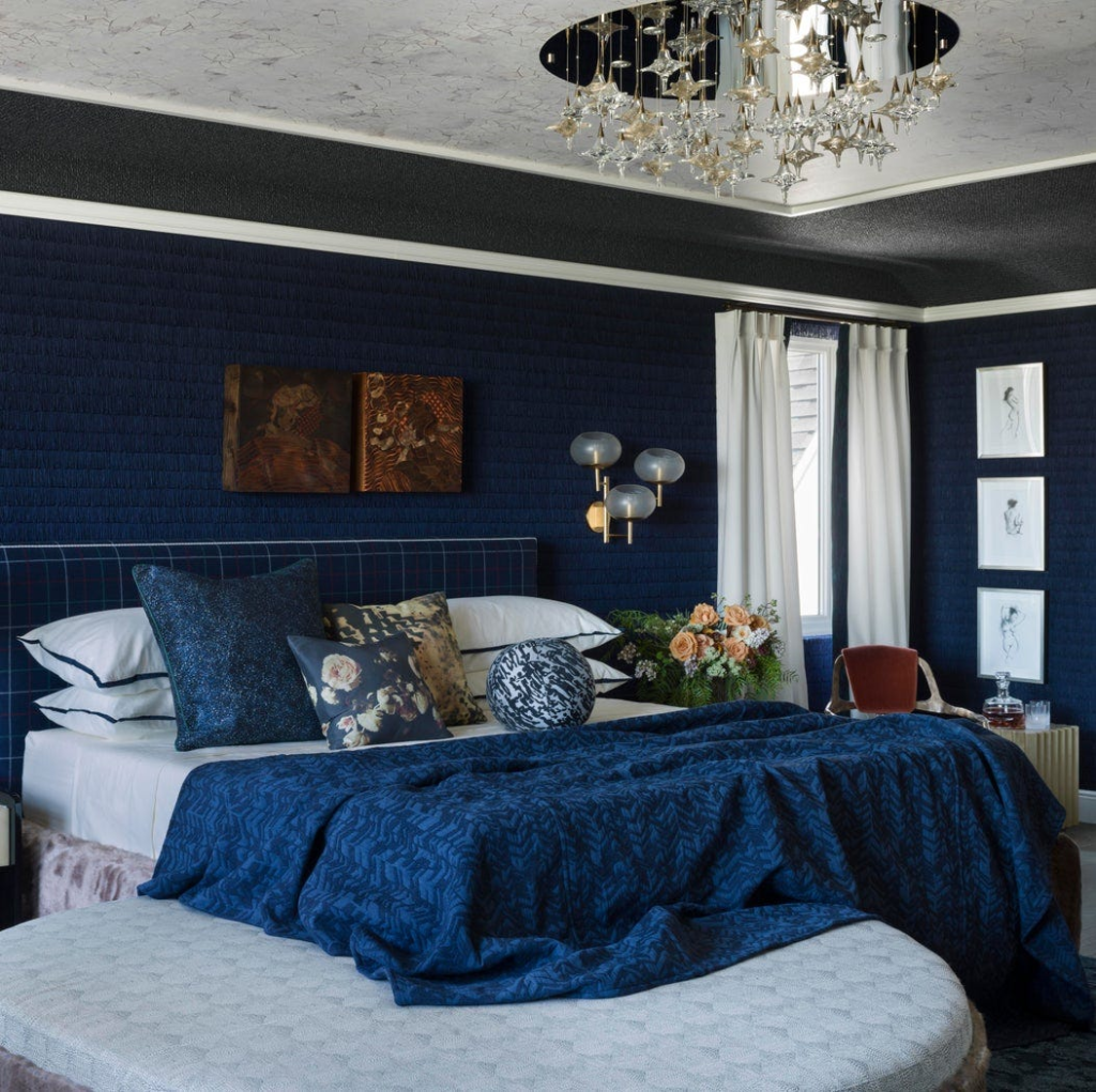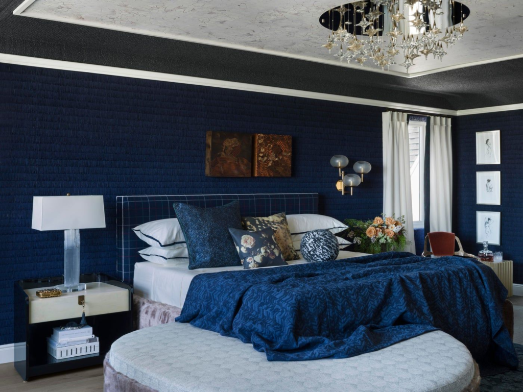 Embrace the drama with midnight blue walls, ceiling, and trim. This enveloping look creates a cozy, cocoon-like space that’s perfect for sleeping.