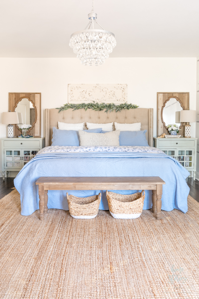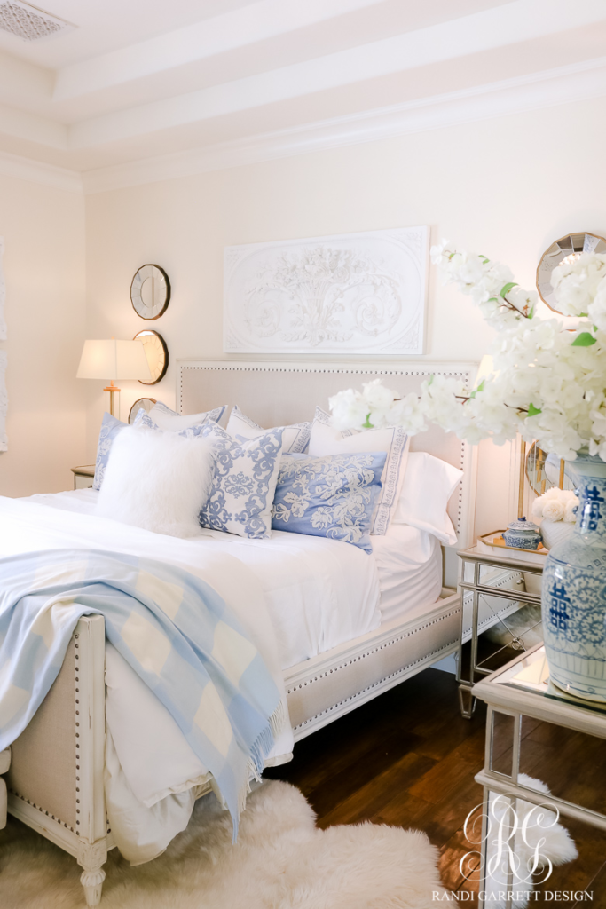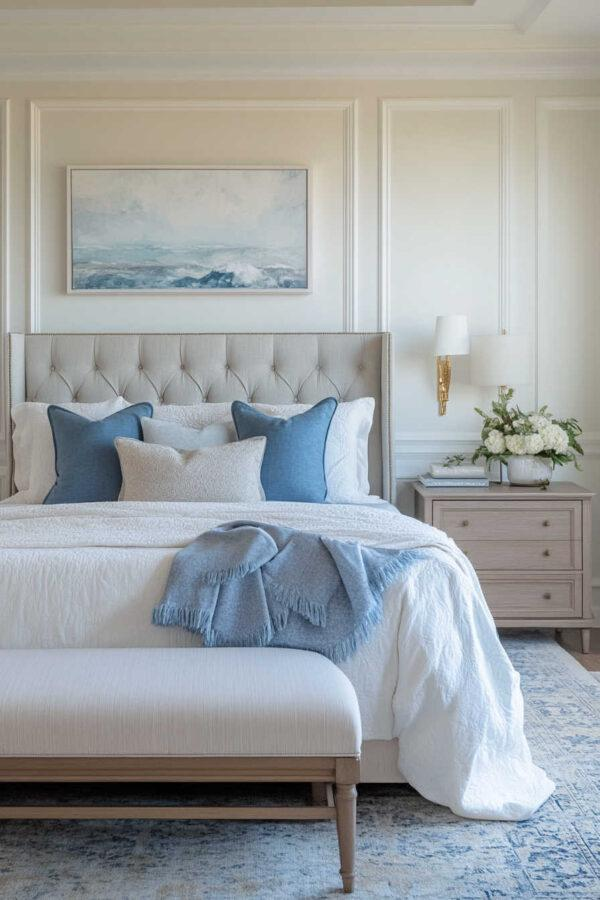 Add blue through bedding, curtains, artwork, and decorative objects. The white backdrop makes the blue pop without feeling heavy. It’s fresh, versatile, and easy to update when you want a change.