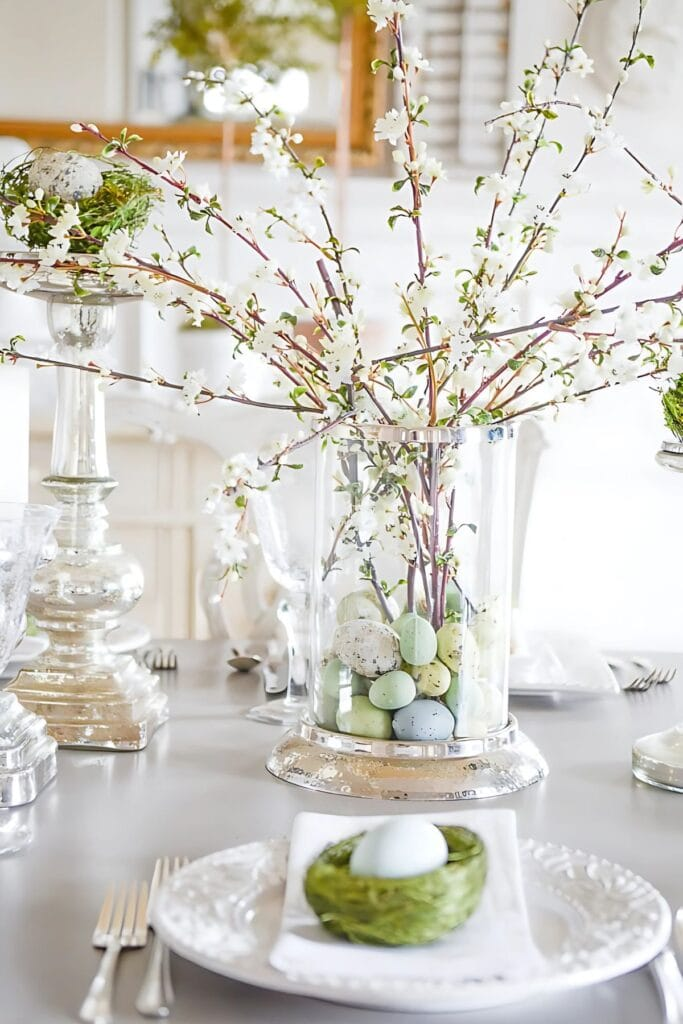 This centerpiece adds height and drama to your table without blocking conversation. The bare branches with just a hint of bloom feel like the very beginning of spring. Choose eggs in colors that complement your table setting – soft pastels for a traditional look, or metallics for something more modern. It’s elegant, natural, and celebrates the season beautifully.