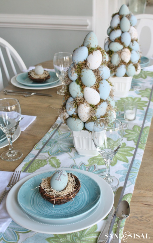 Create a stunning vertical centerpiece by making an egg topiary. Styrofoam eggs in pastel colors are arranged on a cone-shaped form to create a tree-like decoration. It’s impressive, festive, and makes a real statement on your table.