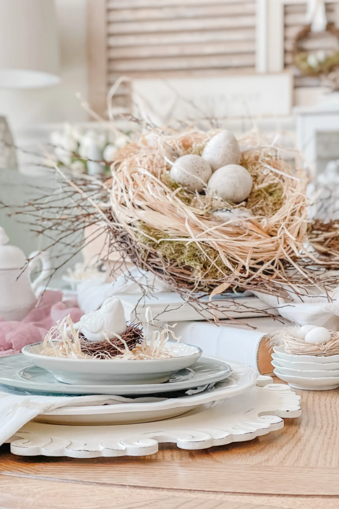 Place the nest on a cake stand or in a shallow bowl to contain any loose materials. Add some faux feathers, moss, or small spring flowers around the base. This centerpiece works beautifully with natural wood tables and linen table runners. It’s simple, elegant, and feels like a treasure found on a spring walk.