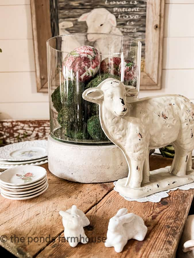 For a centerpiece with nostalgic charm, use a vintage-style ceramic lamb as your focal point and surround it with spring flowers. Lambs are a classic Easter symbol, and they add a sweet, pastoral touch to your table.
