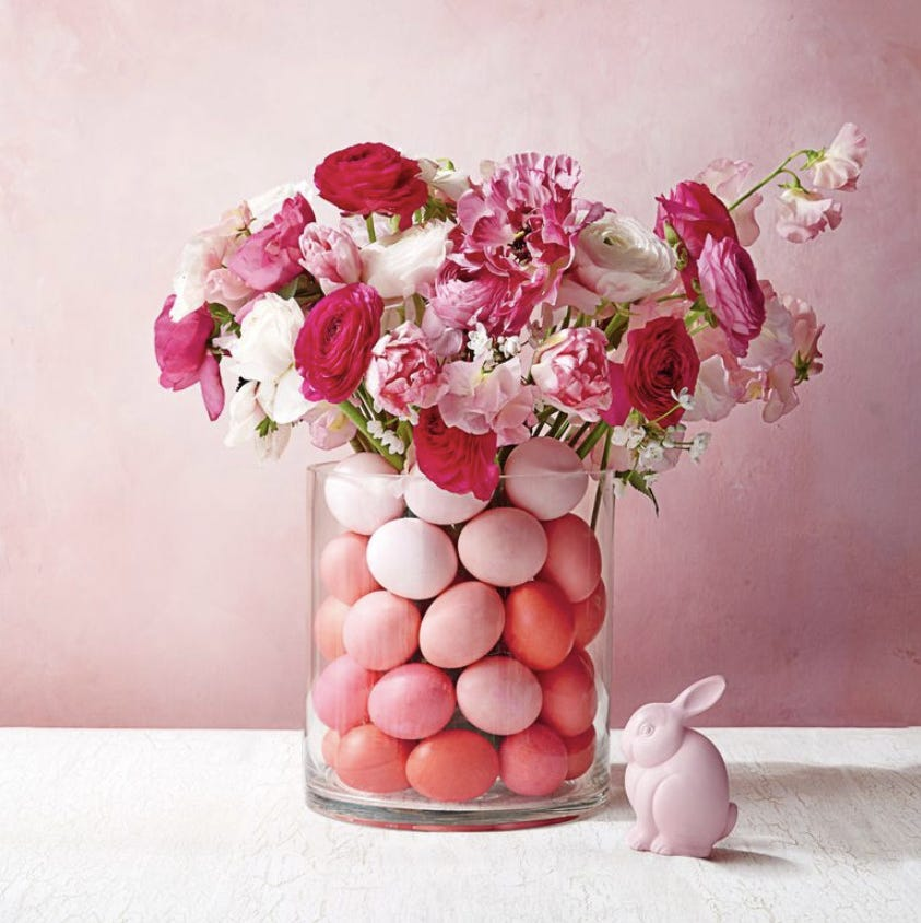 Fill a large clear glass vase with pastel Easter eggs, then arrange a bouquet of tulips inside. The eggs hold the stems in place and create a colorful base that peeks through the flowers.