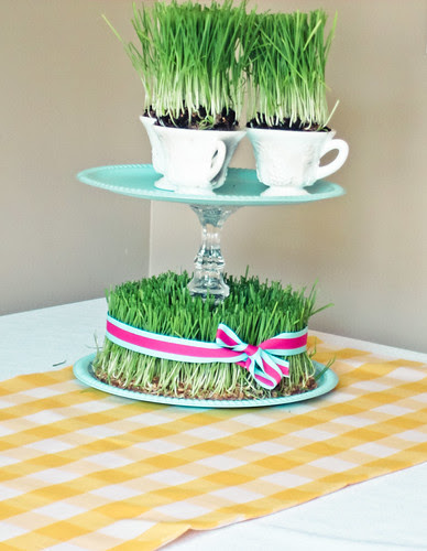 Create a fresh, living centerpiece by growing wheatgrass in teacups and arranging them on tiered cake stands. The bright green grass looks incredibly vibrant against white china and adds a touch of spring freshness to your table.
