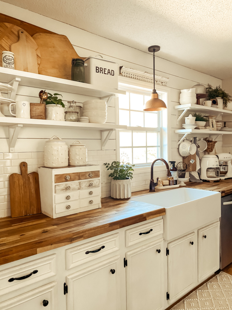 Choose reclaimed wood for rustic charm or sleek walnut for a more modern farmhouse feel. Style the shelves with white dishes, wooden cutting boards, and a few plants for that effortless farmhouse look. Just remember – open shelving means keeping things tidy!