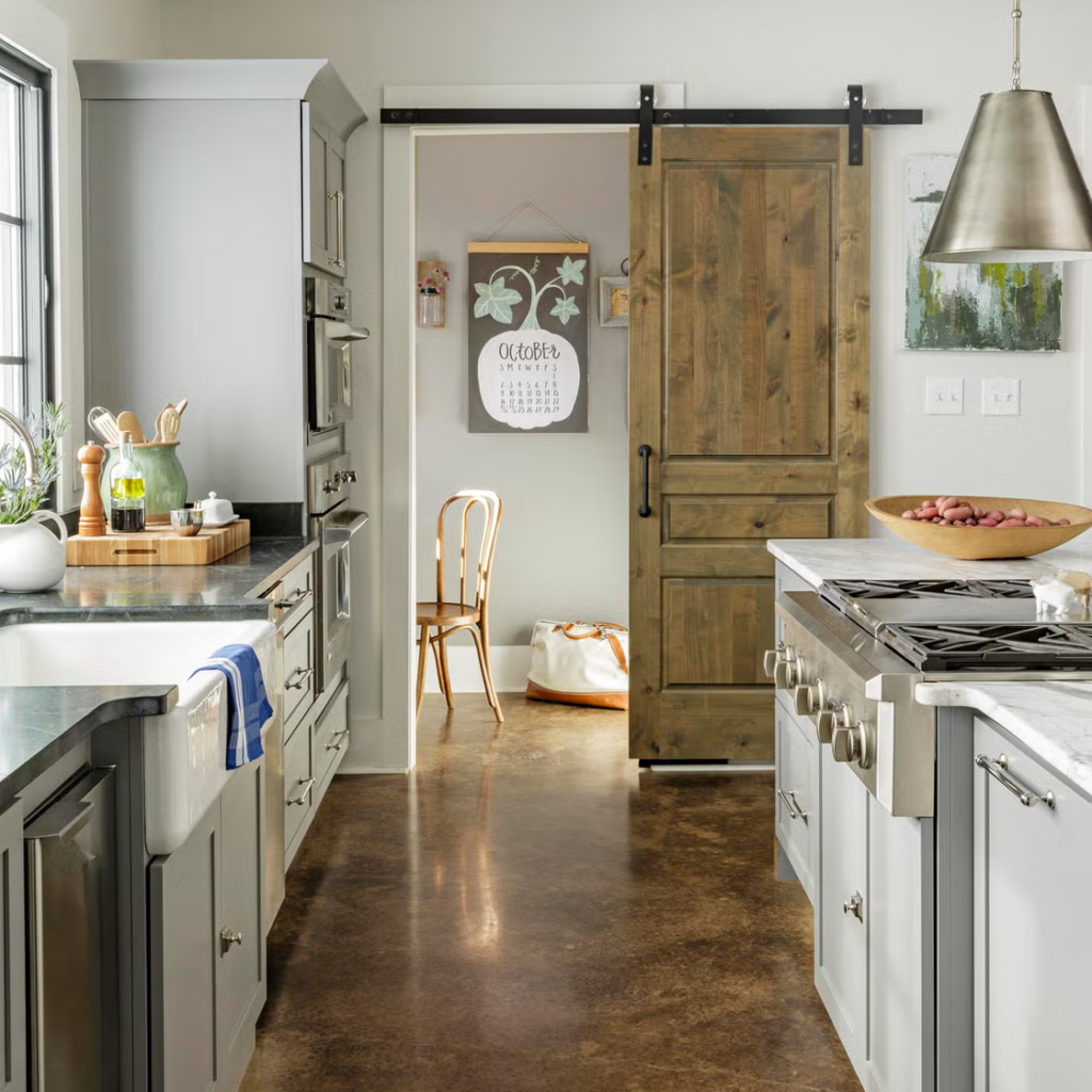 Add authentic farmhouse character with a sliding barn door for your pantry. The exposed hardware and rustic wood create instant charm while saving space – no swing room needed!