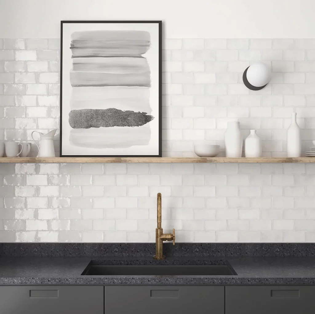 Classic white subway tile is a farmhouse kitchen staple for good reason. It’s affordable, timeless, and works with virtually any style. The rectangular shape and glossy finish reflect light beautifully.