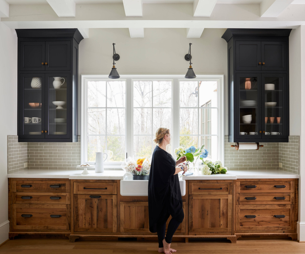 This look is fresh and modern while still feeling rooted in farmhouse tradition. It breaks up the monotony of all-white kitchens and allows you to play with color without overwhelming the space. Plus, darker lowers hide dirt and wear better.