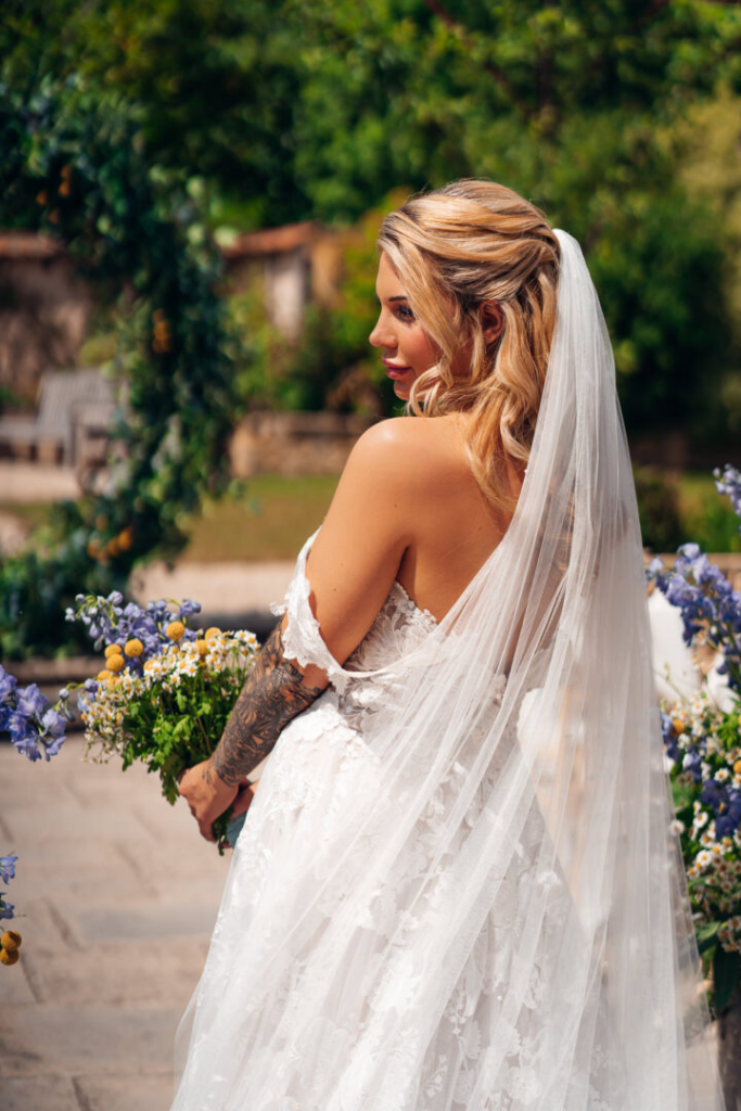 This style is perfect for spring and summer weddings, especially outdoor ones. You can use fresh flowers that match your bouquet or choose silk ones that will last all day. The overall effect is soft, feminine, and effortlessly beautiful. It’s comfortable enough to wear from ceremony to reception without needing touch-ups.