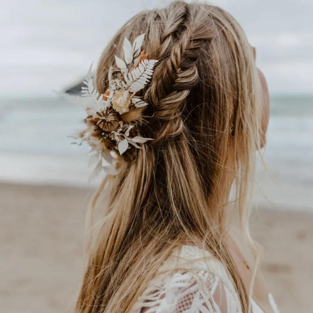 This style is perfect for autumn weddings, desert ceremonies, or any celebration with a natural, laid-back vibe. Dried flowers last longer than fresh ones and can be kept as a memento. The textured finish means you don’t have to worry about every hair being in place – it’s meant to look effortless and free.