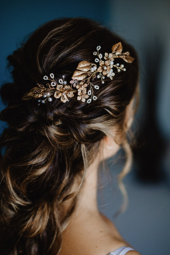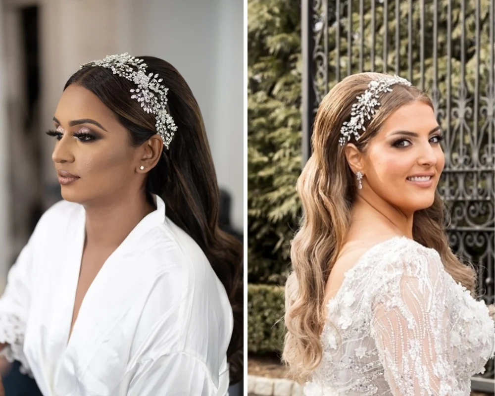 Sometimes simplicity is the ultimate sophistication. This style takes two sections of hair from either side, twists them back, and secures them with a beautiful floral headband. It’s effortless, elegant, and perfect for the bride who wants to look like herself, just elevated.