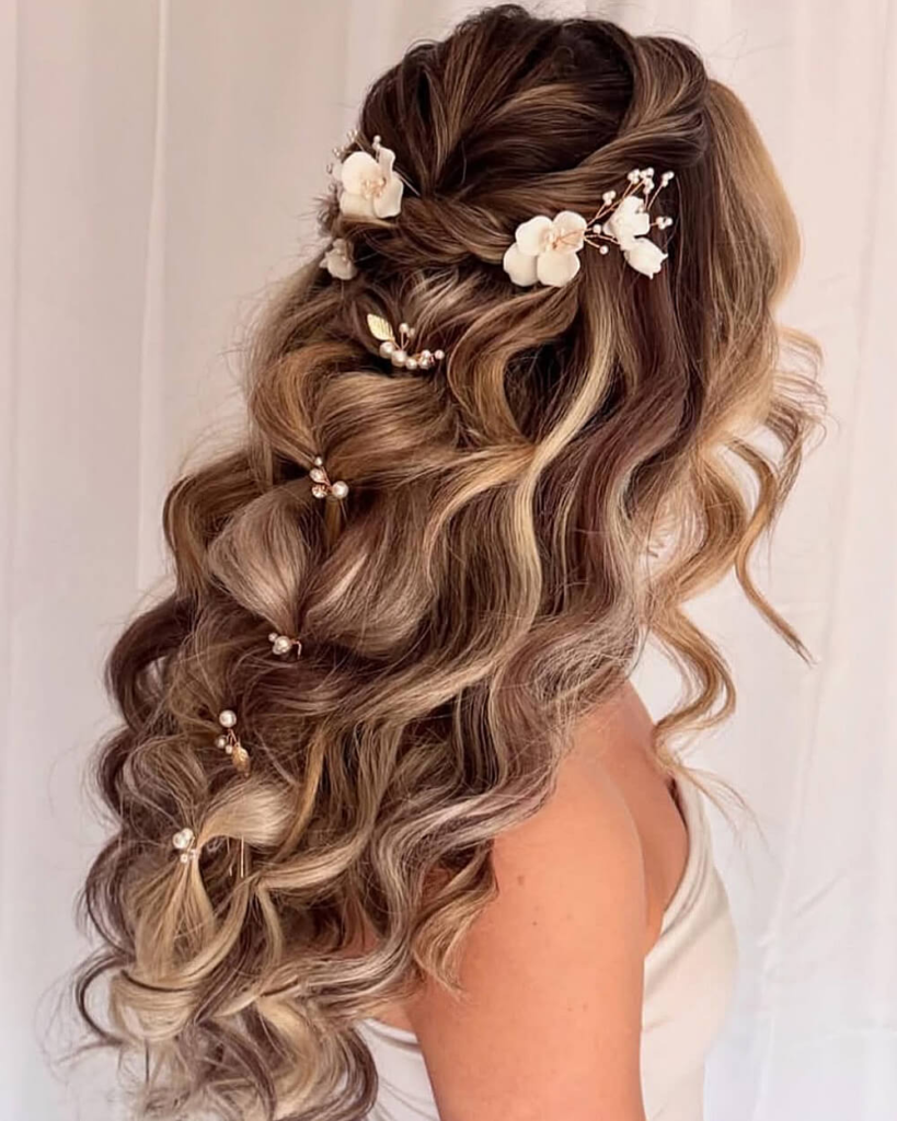 For a romantic, garden-party vibe, try soft curls accented with small floral pins. The top section is gently pulled back to show off your face, while the bottom falls in loose, touchable curls. Small flowers are pinned throughout like scattered petals.