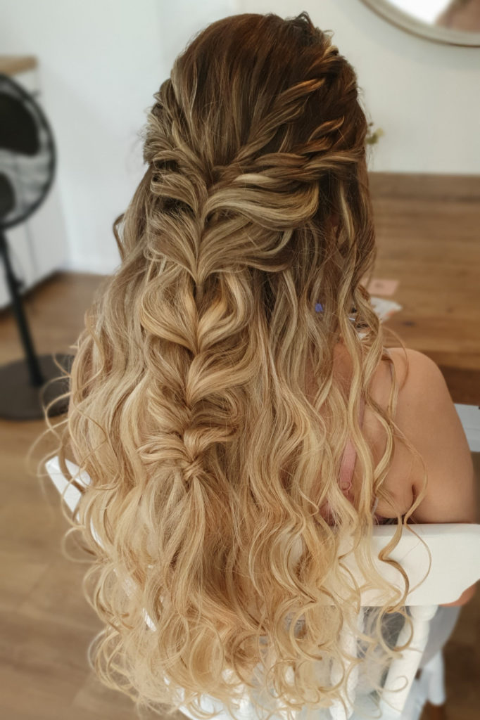 Fishtail braids have this intricate, almost magical quality that makes them perfect for weddings. When incorporated into a half up style, they add beautiful detail and texture. Pair it with loose, romantic curls for a look that’s both polished and relaxed.