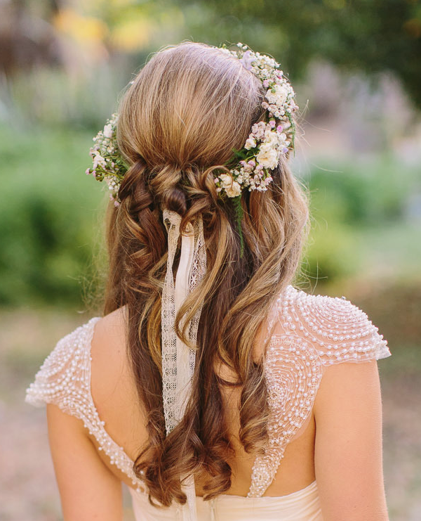 This style is pure romance. A delicate braid wraps around the crown of your head like a halo, securing the top section while soft waves cascade down your back. It’s the kind of look that makes you feel like a woodland fairy princess, but sophisticated enough for a formal wedding.